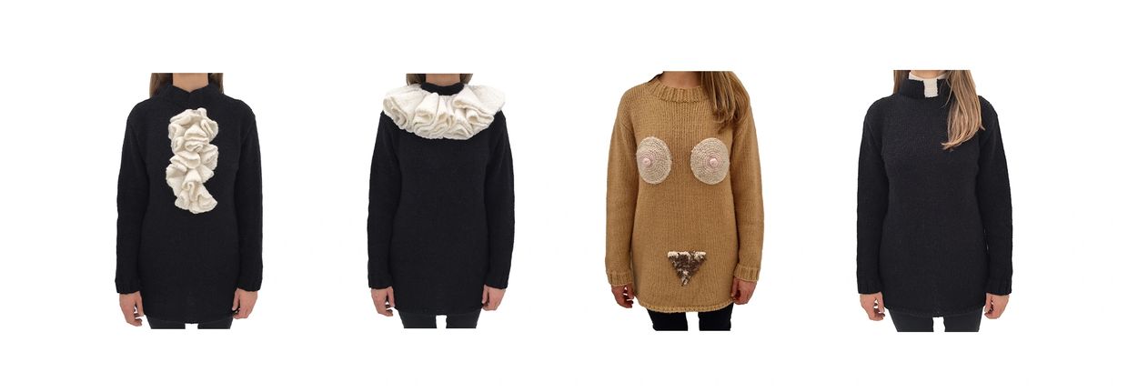 I began documenting my own dream material as an extension of exploring my inner landscape. Similar to the vision of the bride, I found that my dreams included archetypal structures that we encounter in the oldest of narratives. I found myself drawing these ideas and settled upon 4 sources of power: the image of a female dressed in the garments of a priest, noble, and judge, contrasting a single nude. These costumes illustrated the complexity of inhabiting these spaces. It is often the case that the roles represented by these structures have treated the female form as an object of desire, consumption, control, judgement, and punishment. I ran with this idea and worked with Stitching Borders knitting collective--to create these garments and wear them at the 2017 Women’s March of Los Angeles. After that I experimented with wearing the sweaters in public. Later, women that I knew personally expressed interest in wearing the sweaters out of curiosity, similar to an inquiry or investigation.Photographers, Elizabeth Beristain and Lourdes Valdés later documented the walks.
