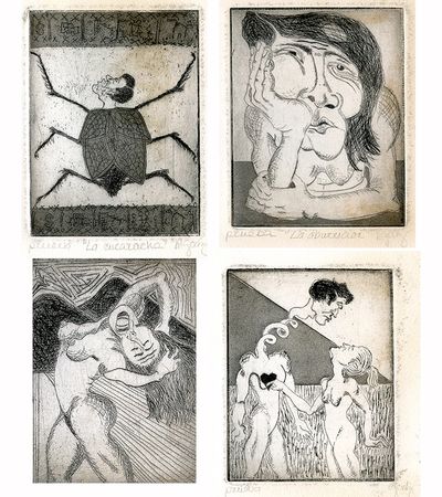 Series of etchings inspired by “Los Caprichos de Goya”. In these etchings, the elaboration of symbols expresses feelings of life experiences. With the perspective of the passage of time based on memory, memories take shape within small-scale black and white dry points in the etchings.